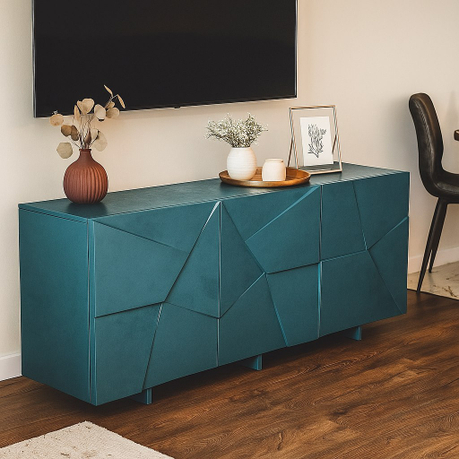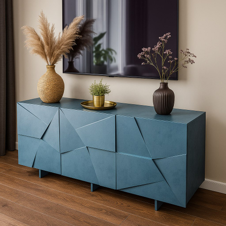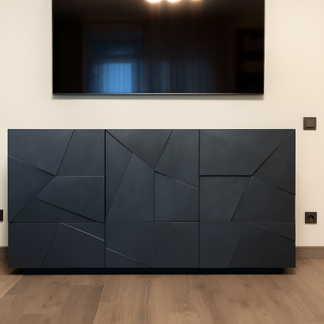 Рисунок фасадов создается с помощью фрезеровки. Ломаные грани разных форм и размеров создают интересный объемный узор, который смотрится единым полотном на всей плоскости фасадов.