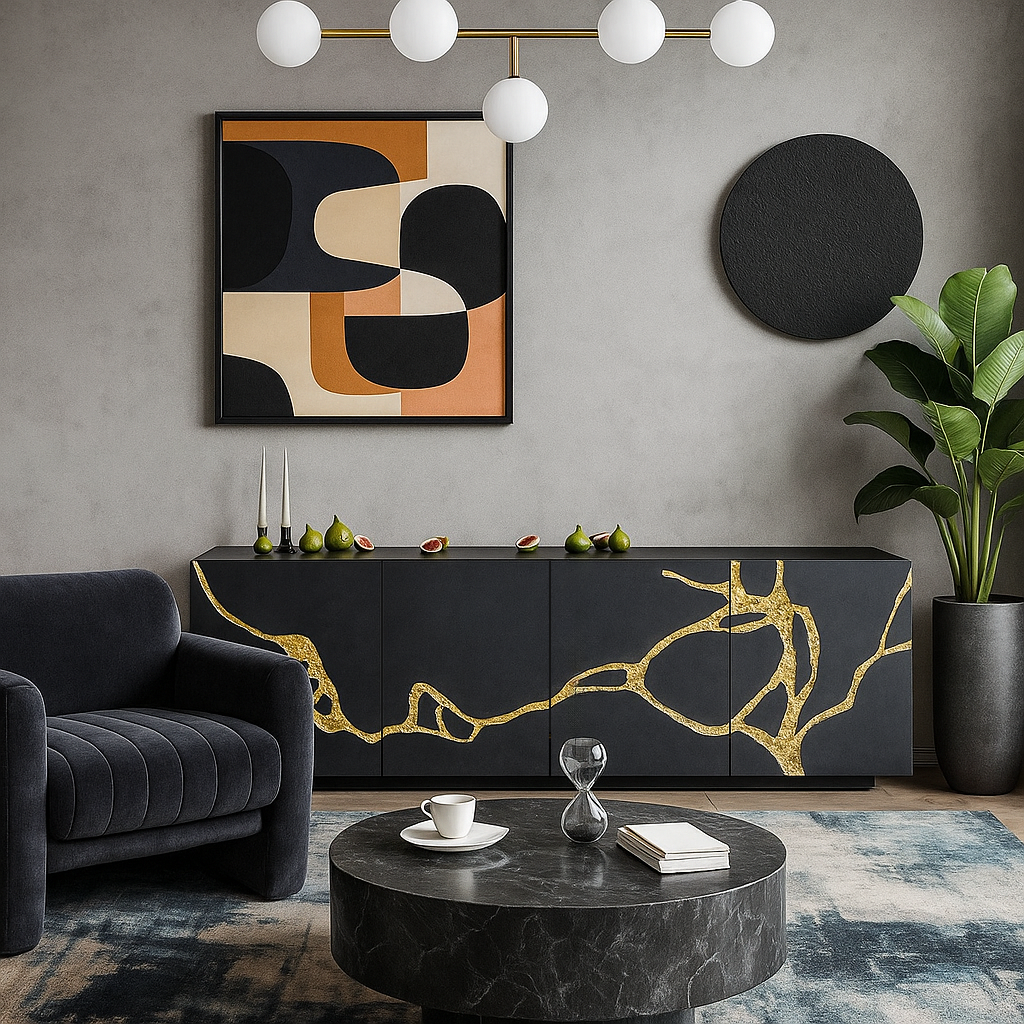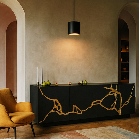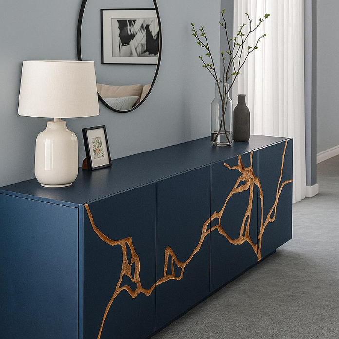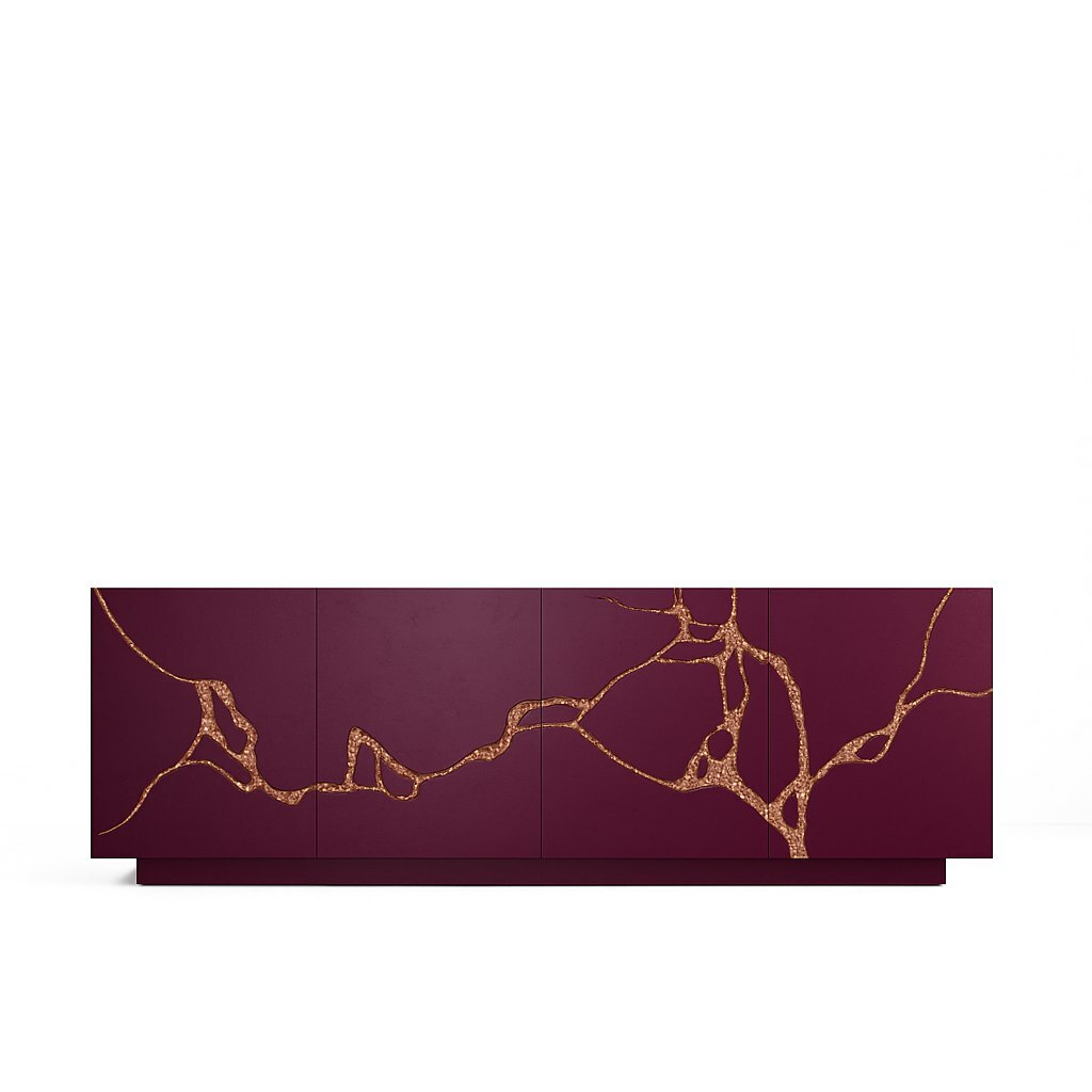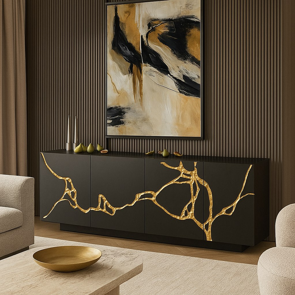 Шкаф выполнен из МДФ с фрезерованными фасадами, которые покрыты специальным составом с эффектом золота. Дверцы открываются простым нажатием. Дизайн шкафа вдохновлён вулканическим пеплом и расплавленной лавой, создавая уникальную и притягательную атмосферу.