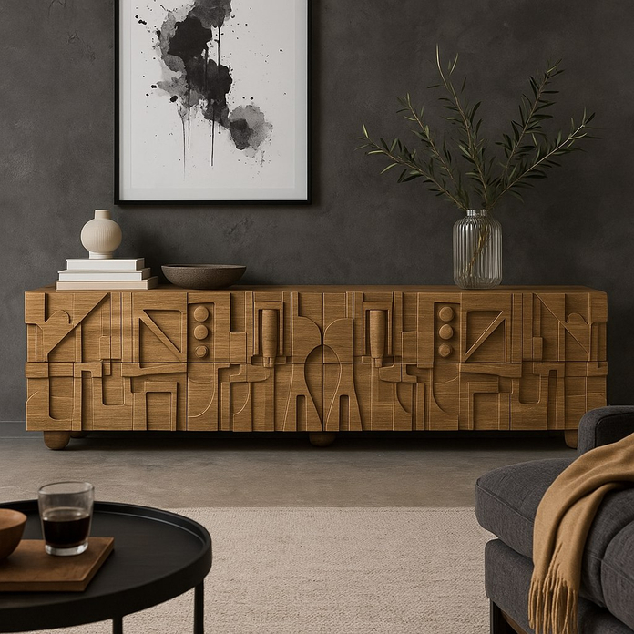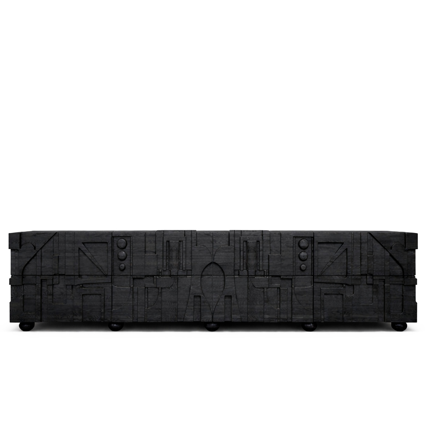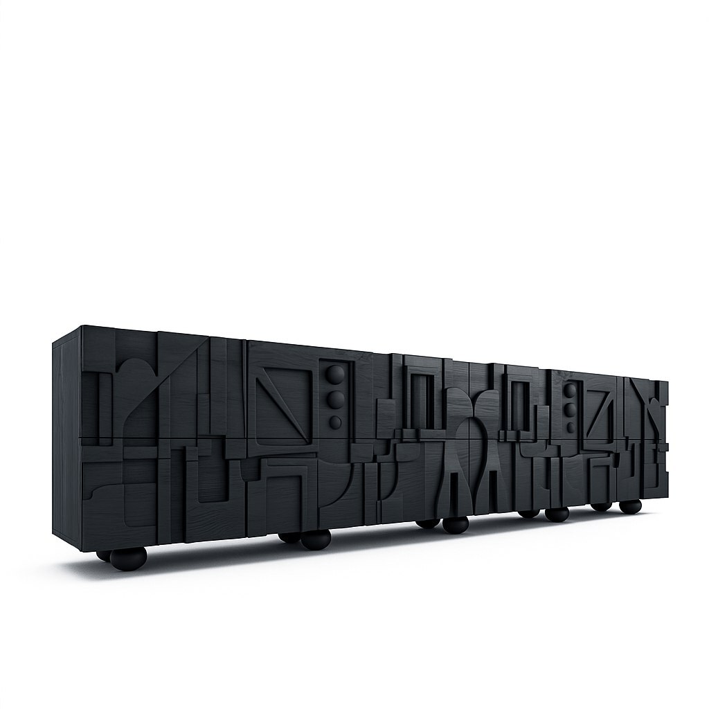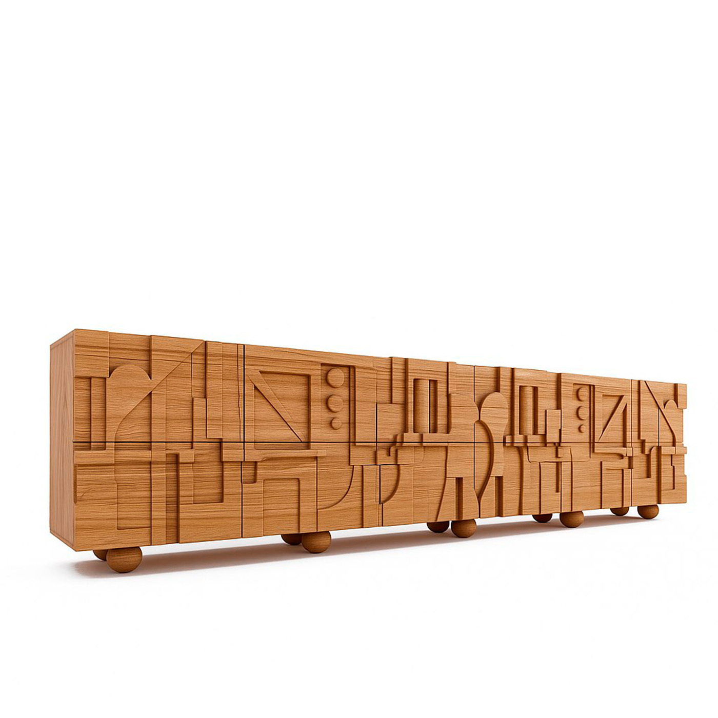 Комод Tribe привлекает внимание выразительным геометрическим узором на фасаде. Корпус выполнен из массива дерева, а внутреннее наполнение — из шпонированного МДФ.
