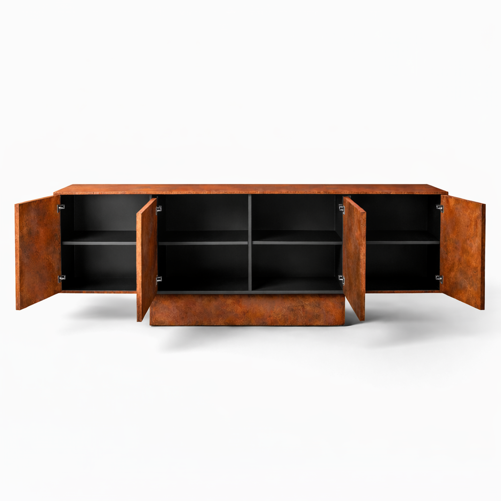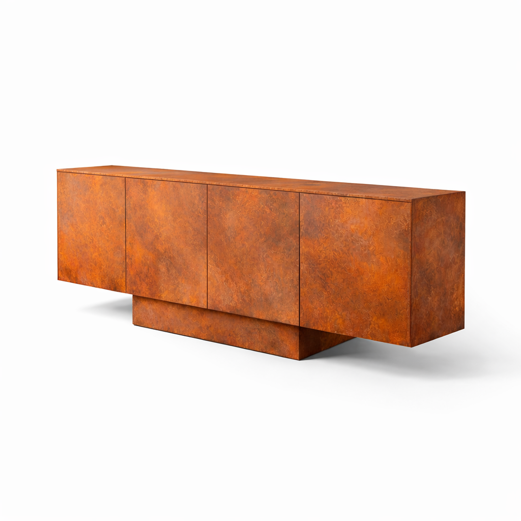 Комод покрыт декоративной краской, имитирующей цвет картоновой стали. Это достигается благодаря работе декораторов и смешиванию различных оттенков. Также можно заказать комод в эксклюзивных цветах.