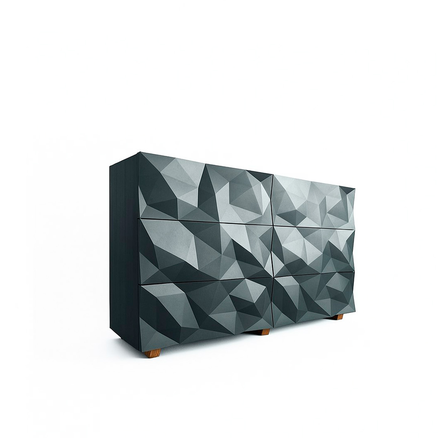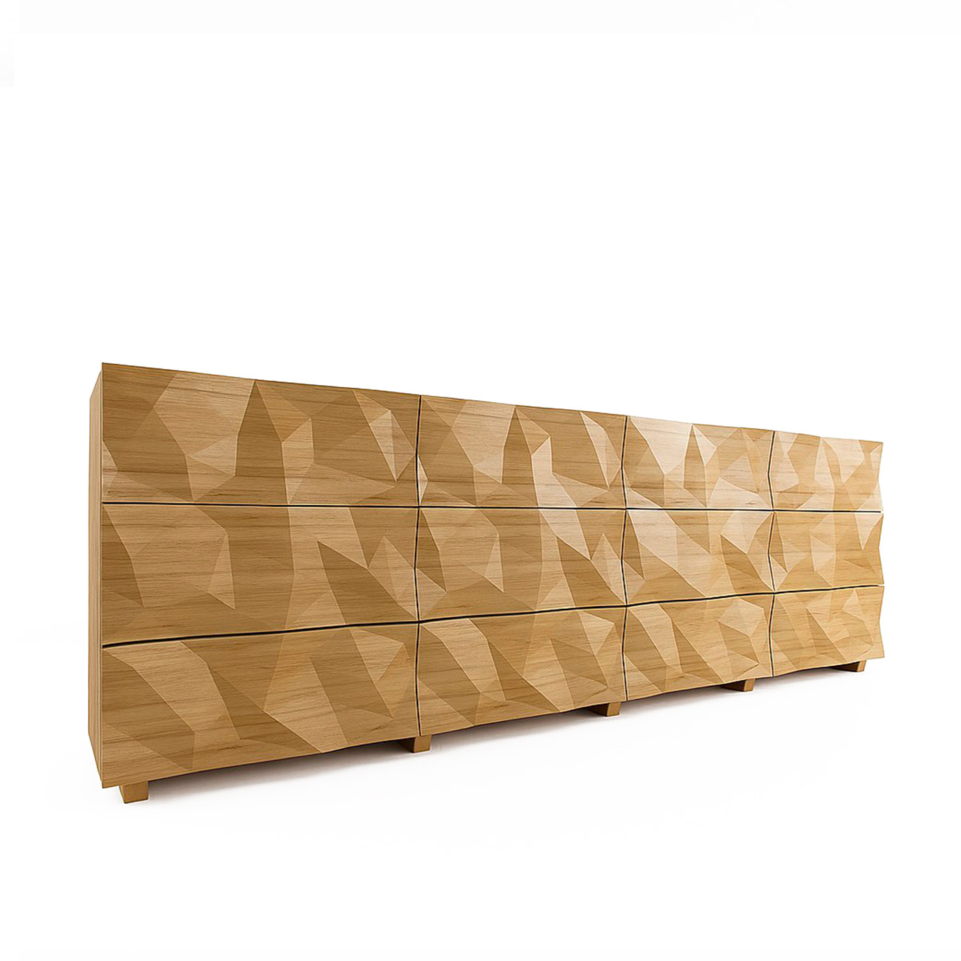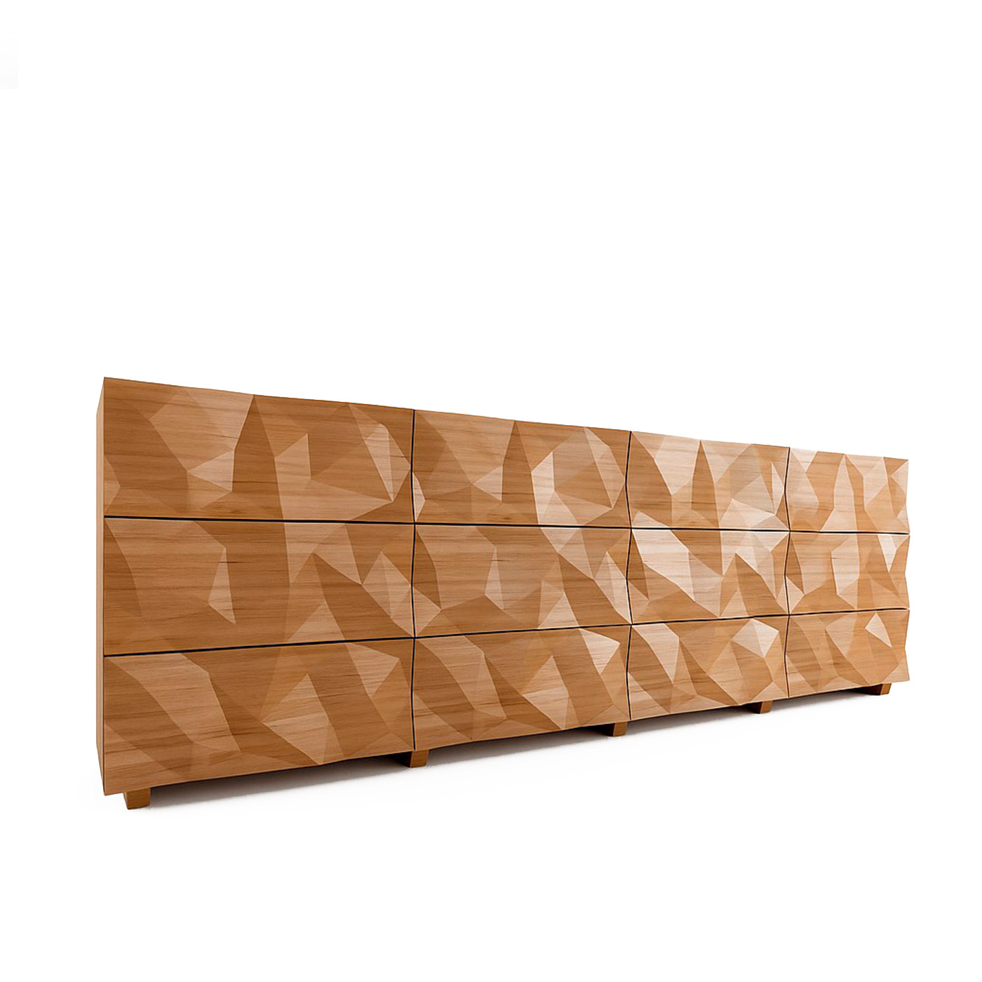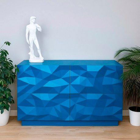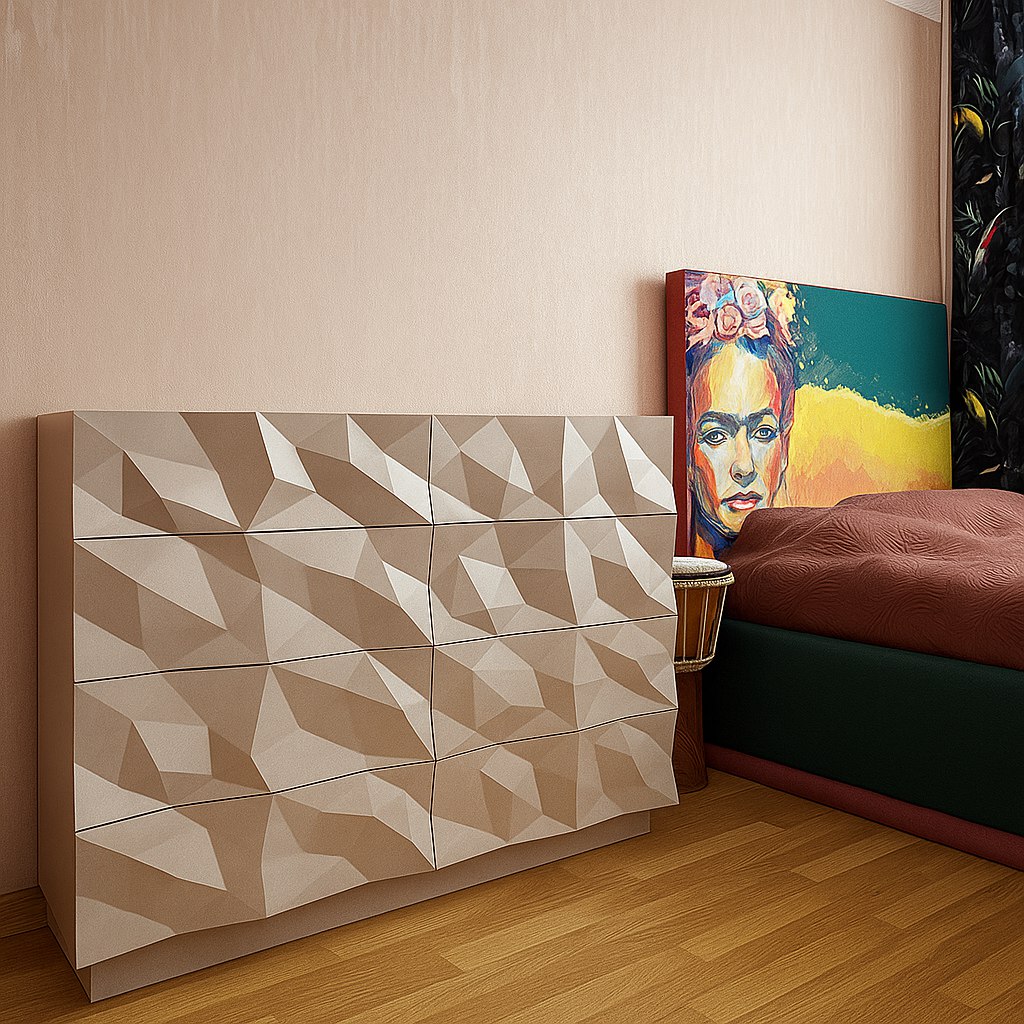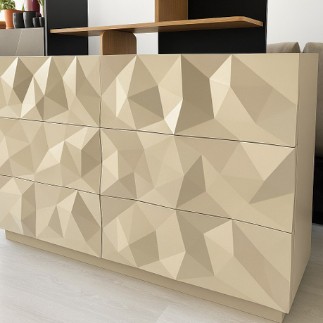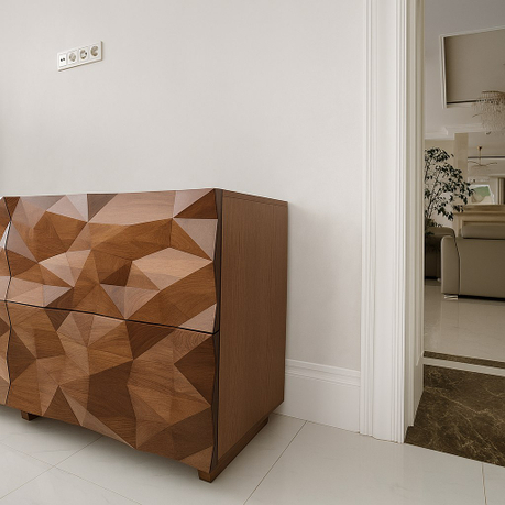 Рисунок фасадов создается с помощью фрезеровки. Ломаные грани разных форм и размеров создают интересный объемный узор, который смотрится единым полотном на всей плоскости фасадов.