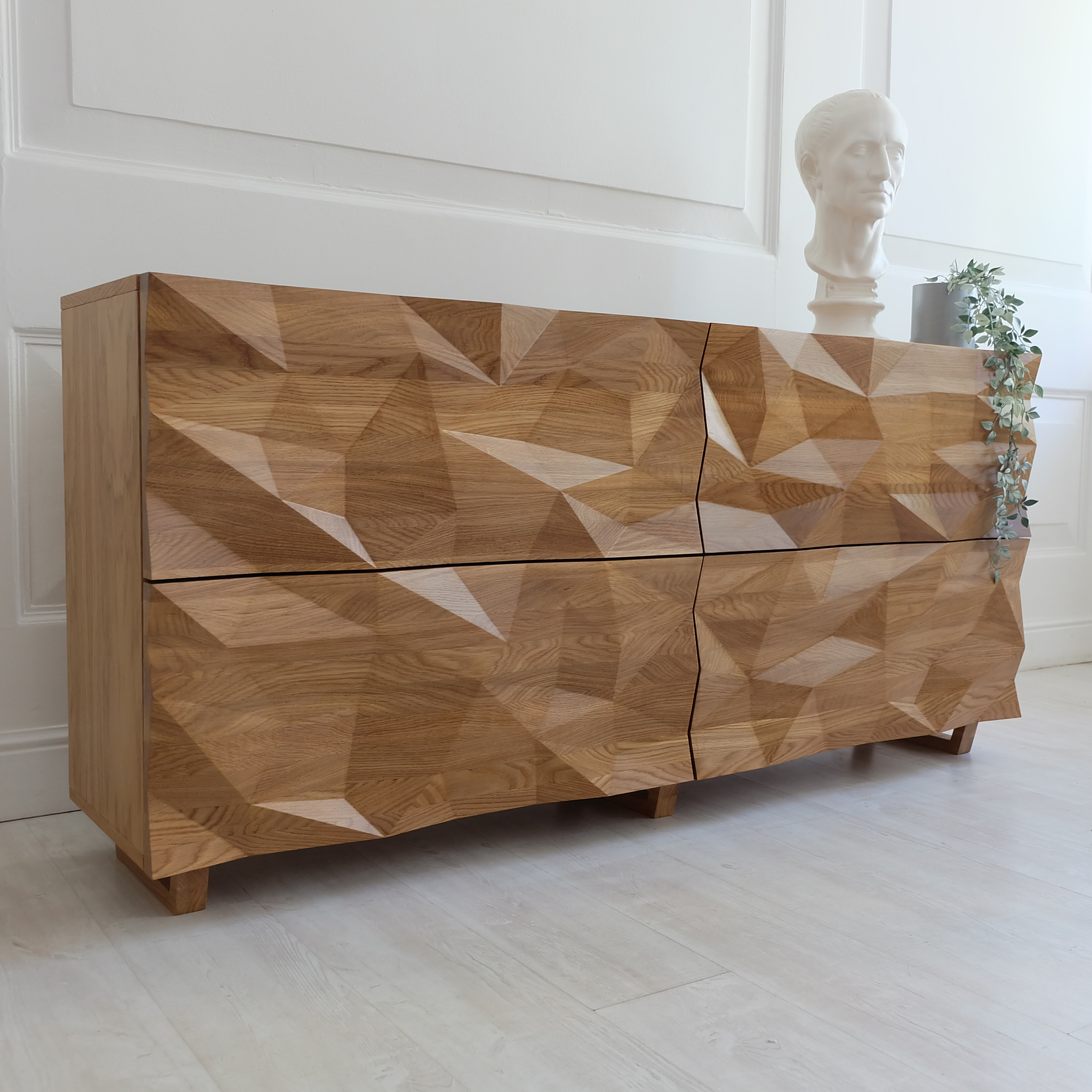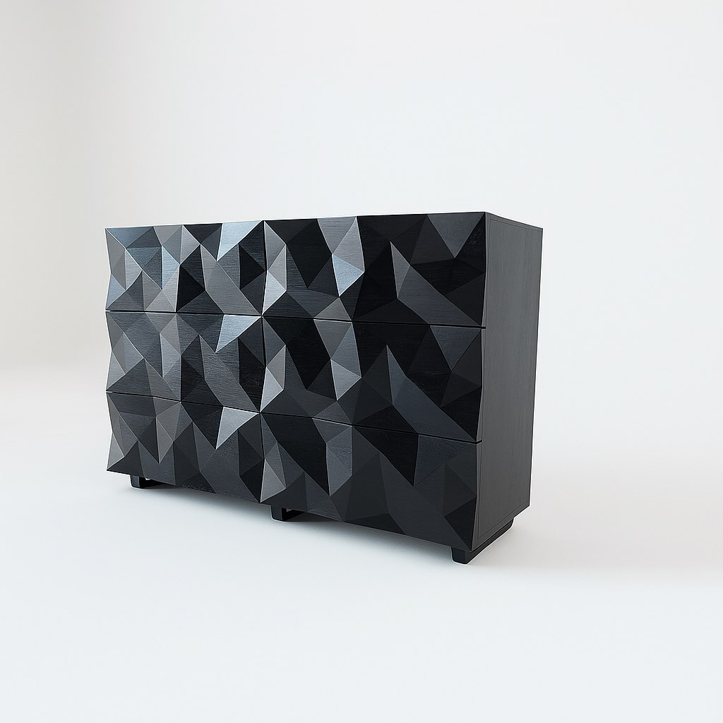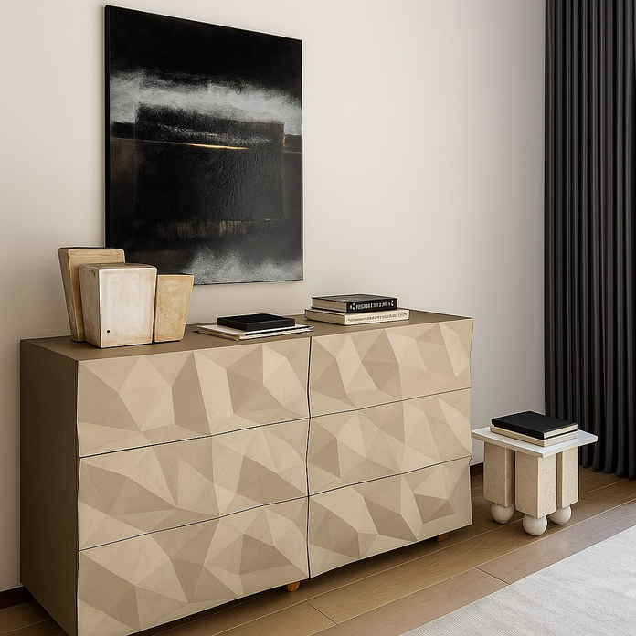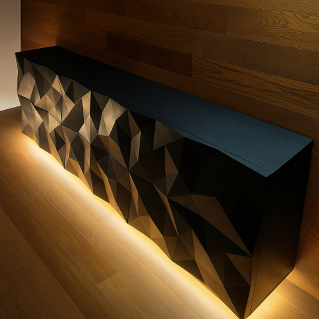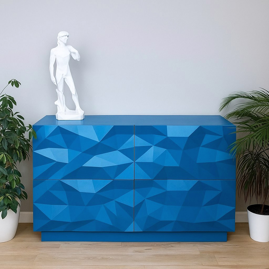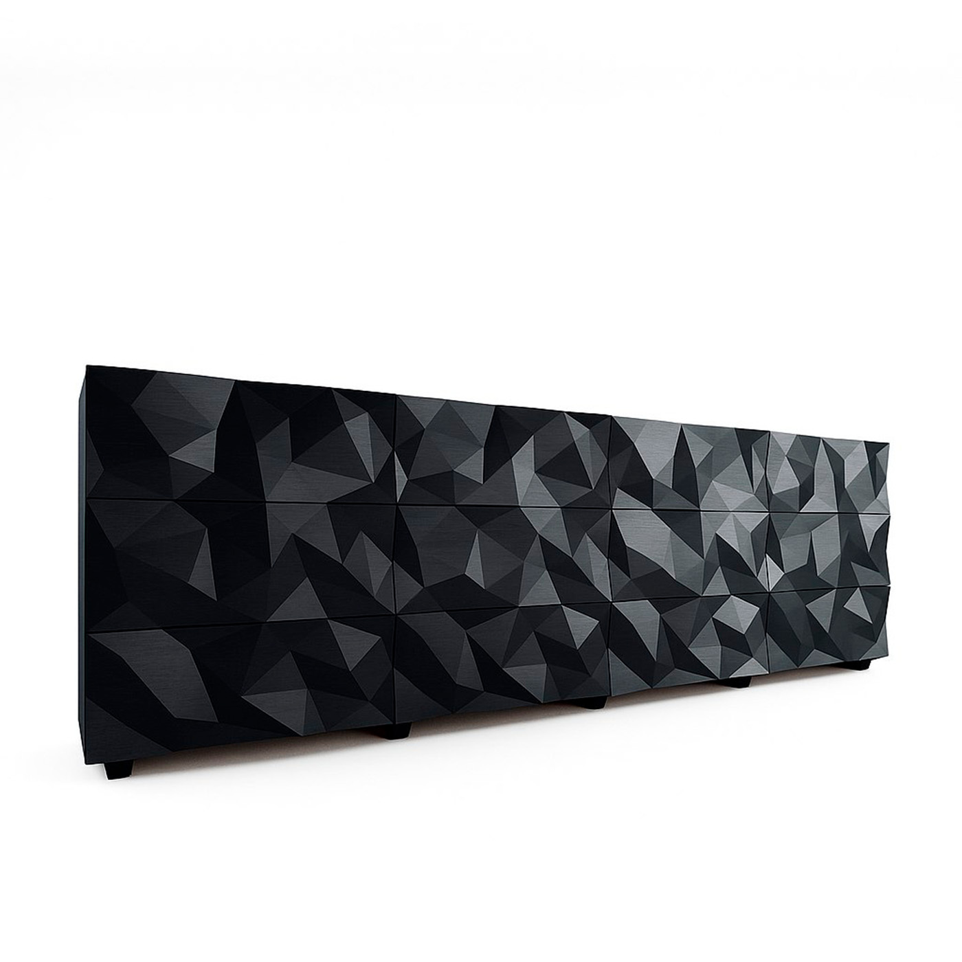 Рисунок фасадов создается с помощью фрезеровки. Ломаные грани разных форм и размеров создают интересный объемный узор, который смотрится единым полотном на всей плоскости фасадов.