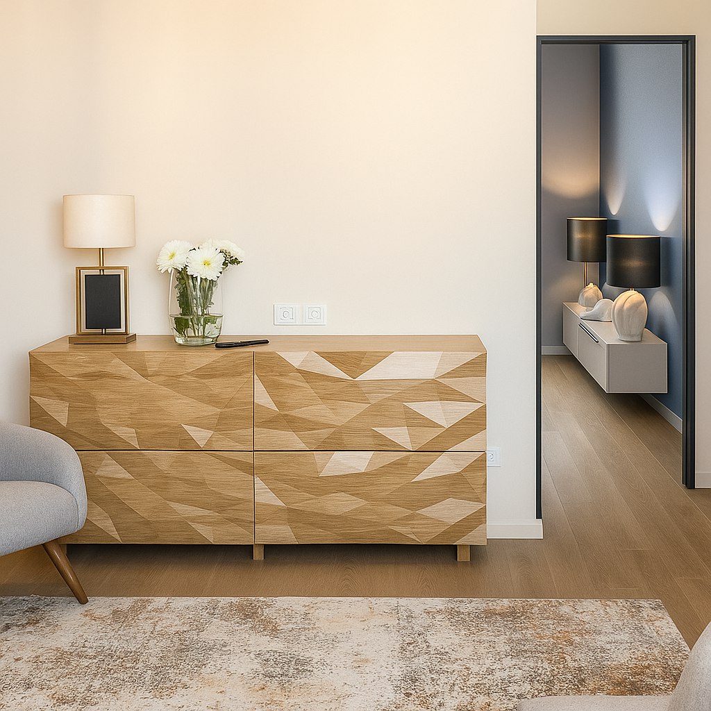 Умная подсветка комода также управляется от Яндекс Станции, позволяя создавать разнообразные сценарии освещения, регулируя температуру, яркость и цвет.