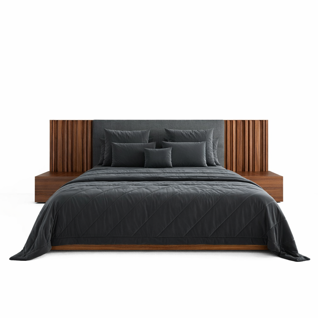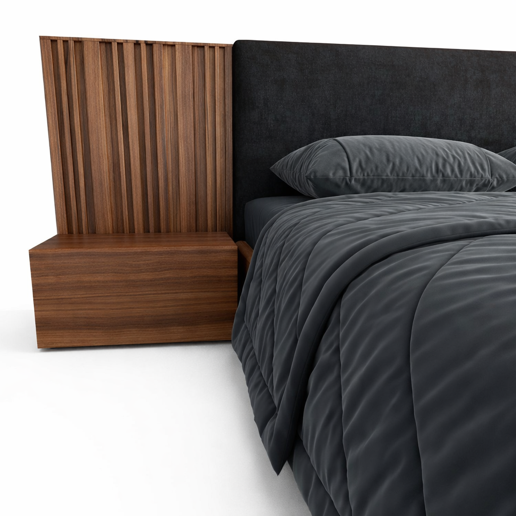 Каркас кровати Ti изготовлен из шпонированного МДФ. Изголовье выполнено из таких же планок.