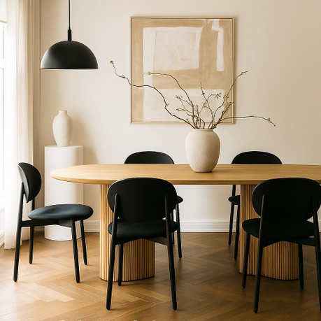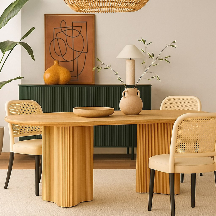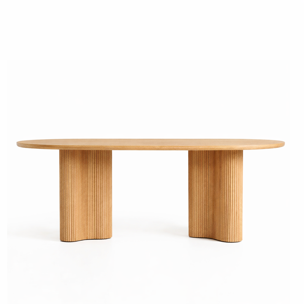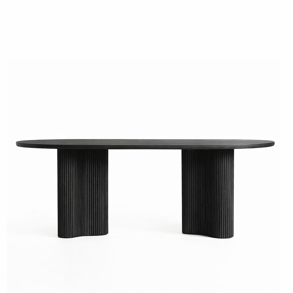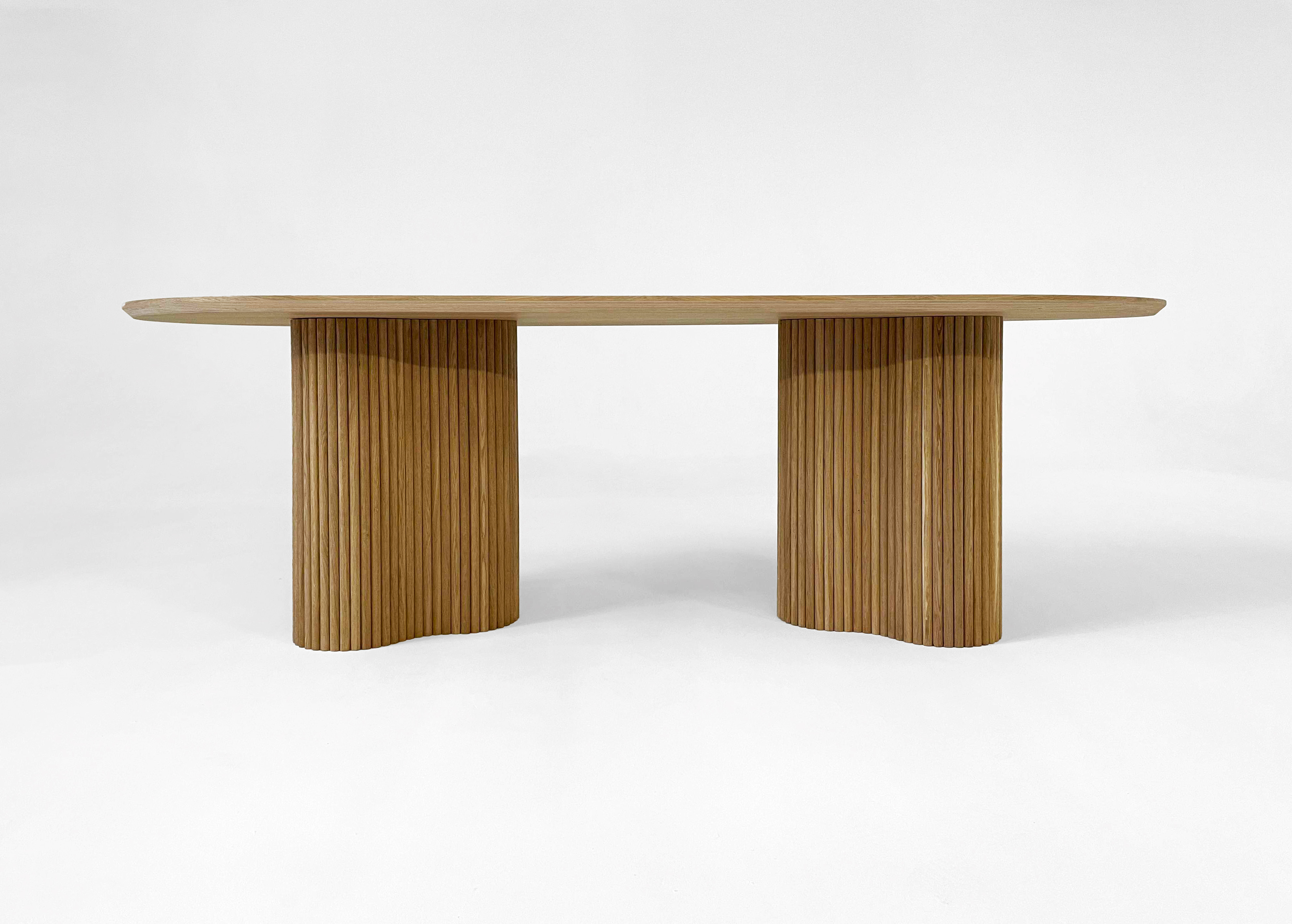 Офисный стол Stick №2 имеет подстолье из полукруглых дубовых палочек. Столешницу можно выбрать из шпонированной фанеры толщиной 3 см или покрыть прочным микроцементом. Также доступна модификация из массива дуба.