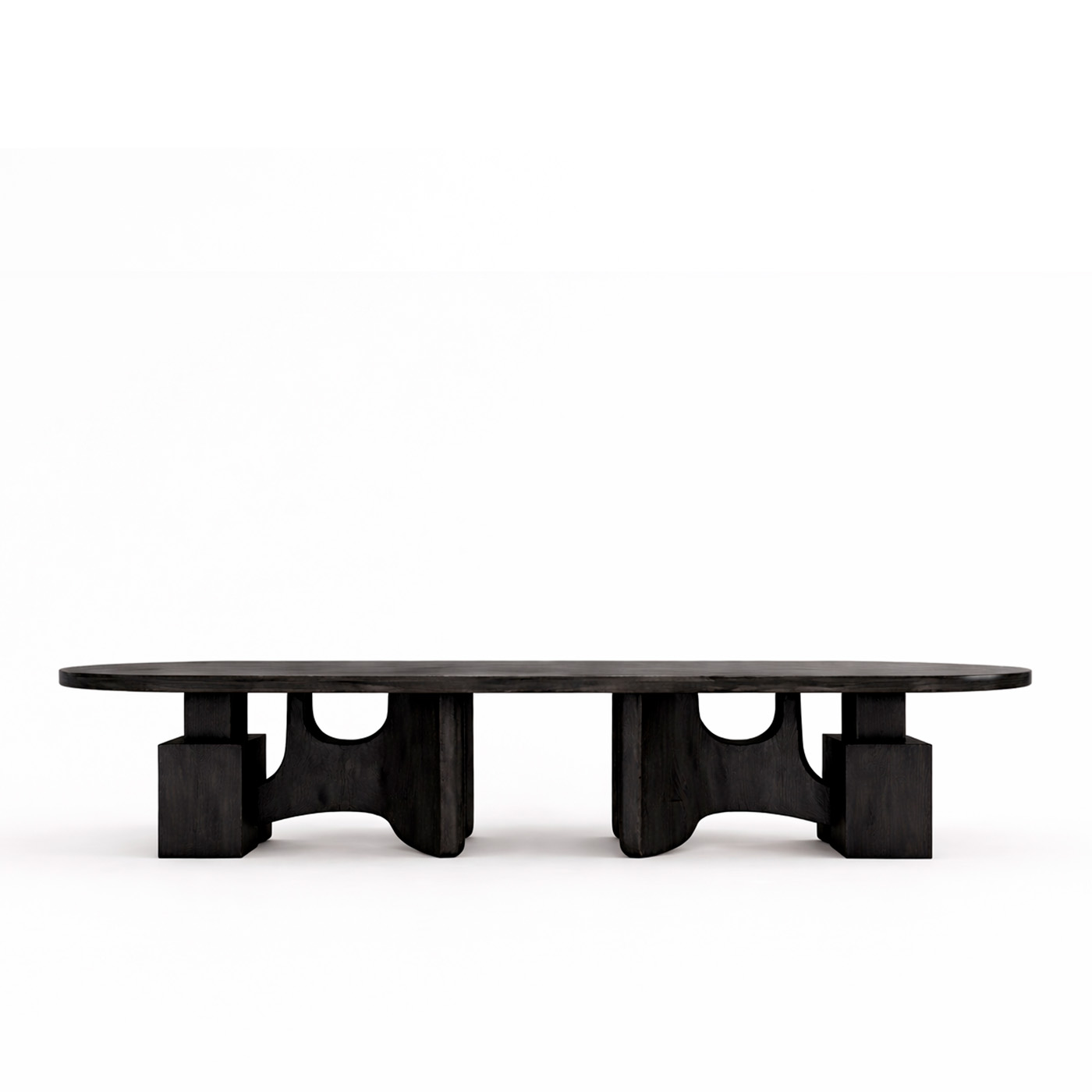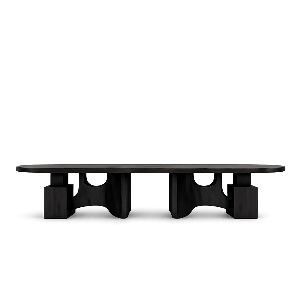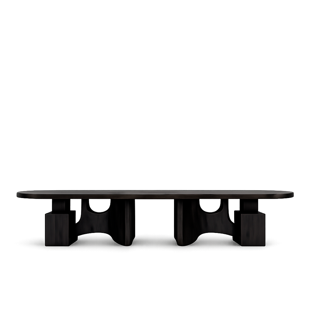 Монументальная овальная столешница словно парит над скульптурными опорами с мягкими арочными вырезами. Эта конструкция придаёт столу визуальную лёгкость, сохраняя при этом ощущение абсолютной надёжности и статуса.
