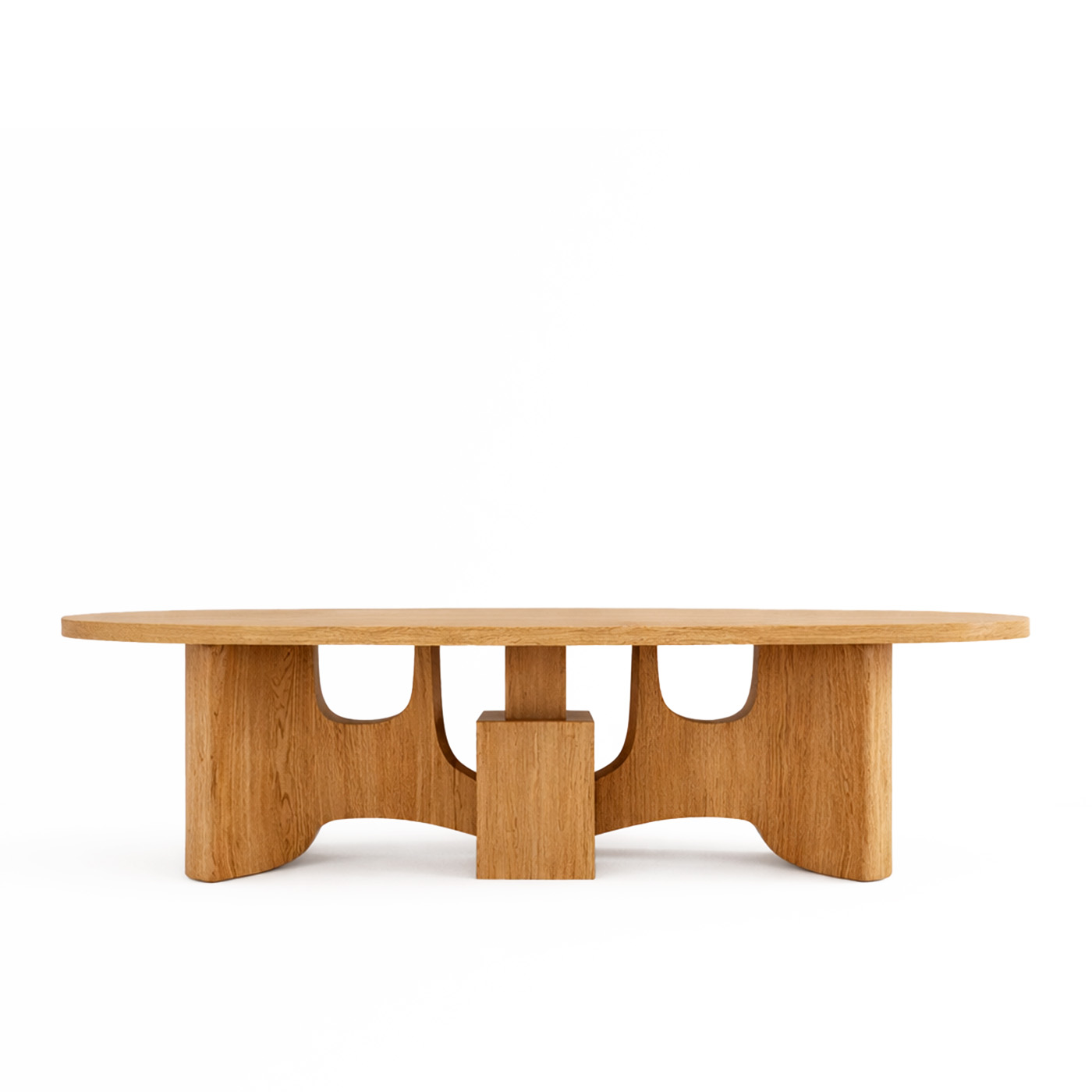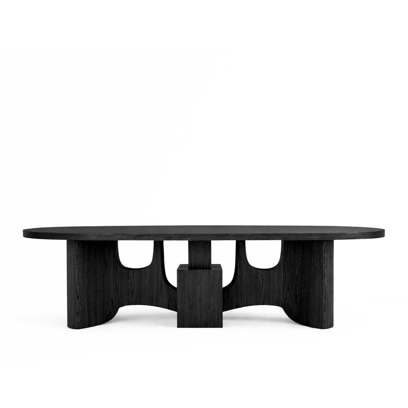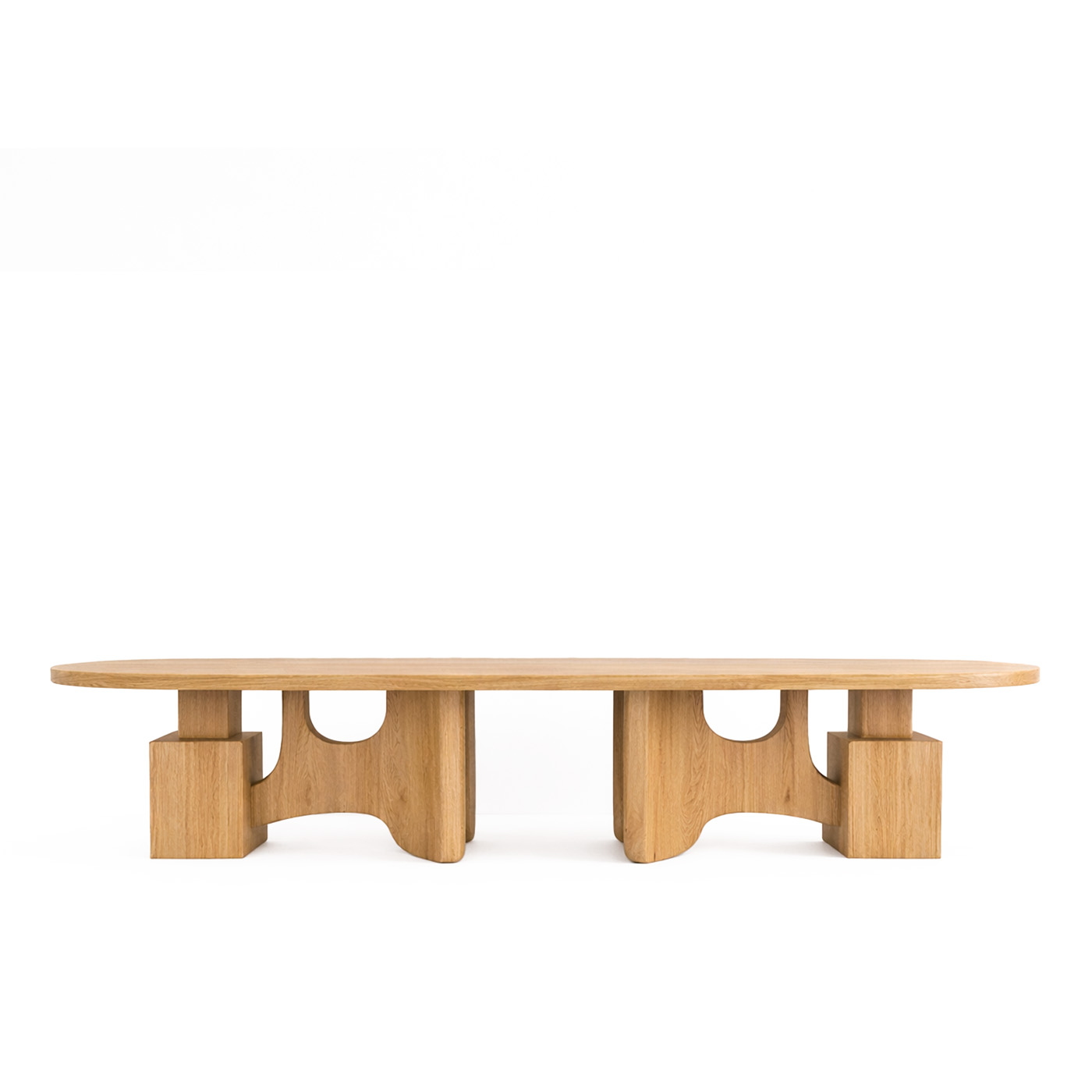 Монументальная овальная столешница словно парит над скульптурными опорами с мягкими арочными вырезами. Эта конструкция придаёт столу визуальную лёгкость, сохраняя при этом ощущение абсолютной надёжности и статуса.