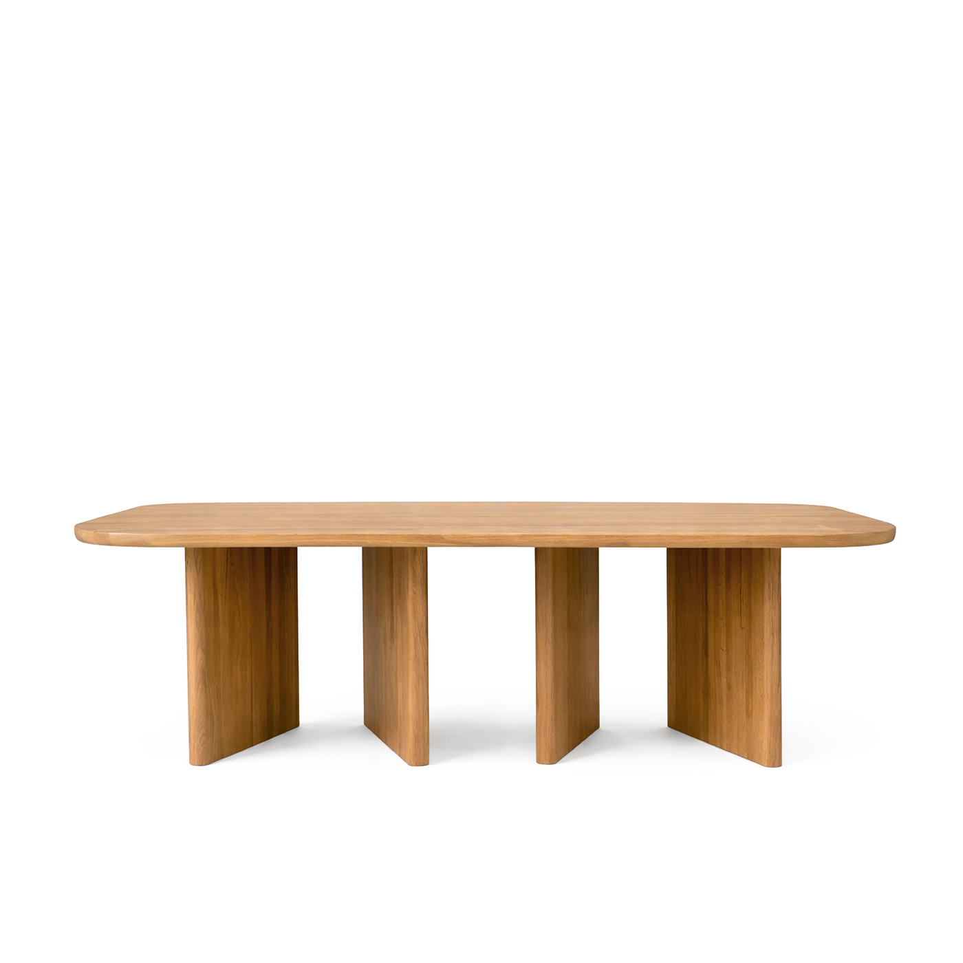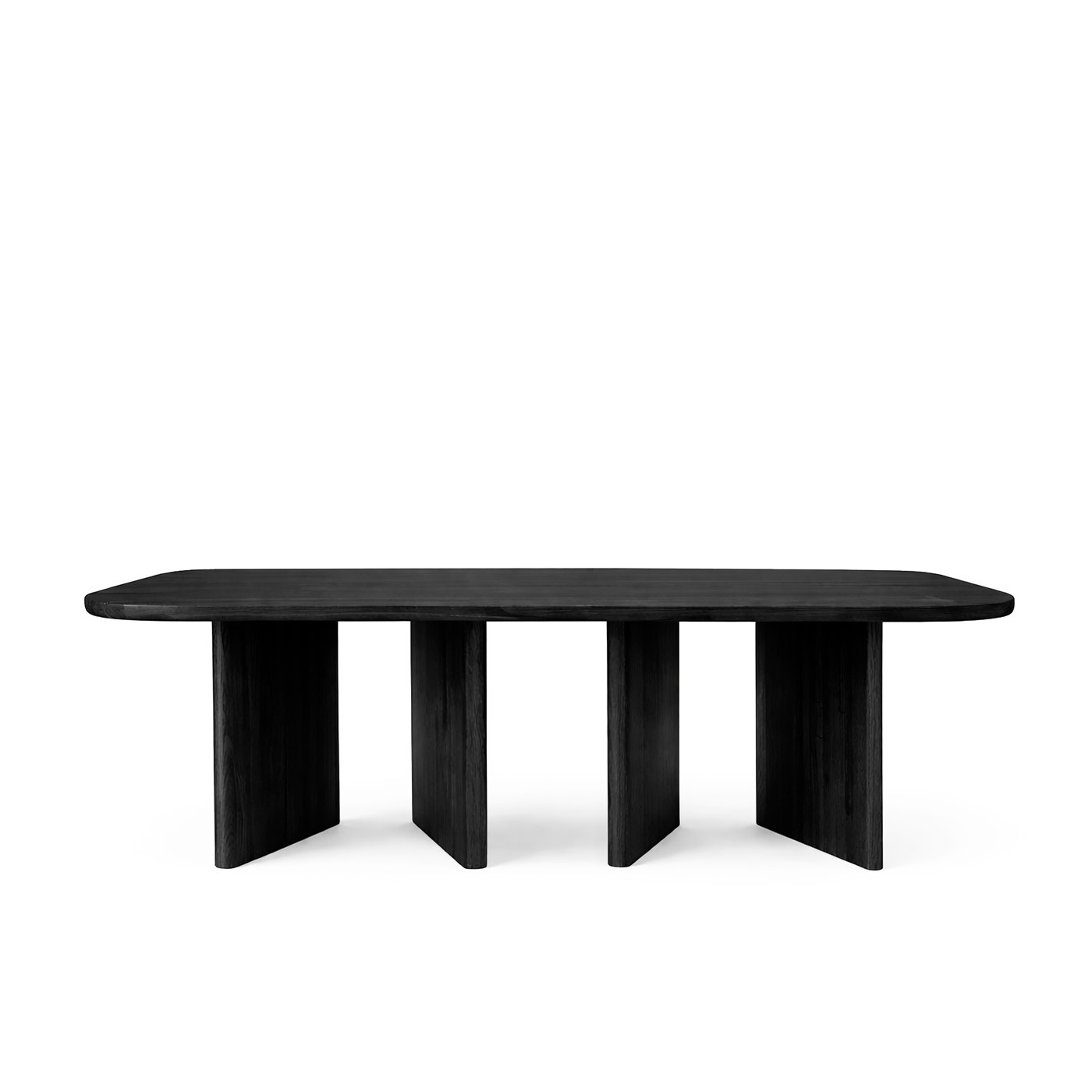 Края столешницы и ножки также изготовлены из массива дуба и выполнены со скруглёнными формами, что подчёркивает цельность дизайна и добавляет ощущение тактильного комфорта. Скругления смягчают общий образ и делают стол визуально лёгким, несмотря на массивность материала.