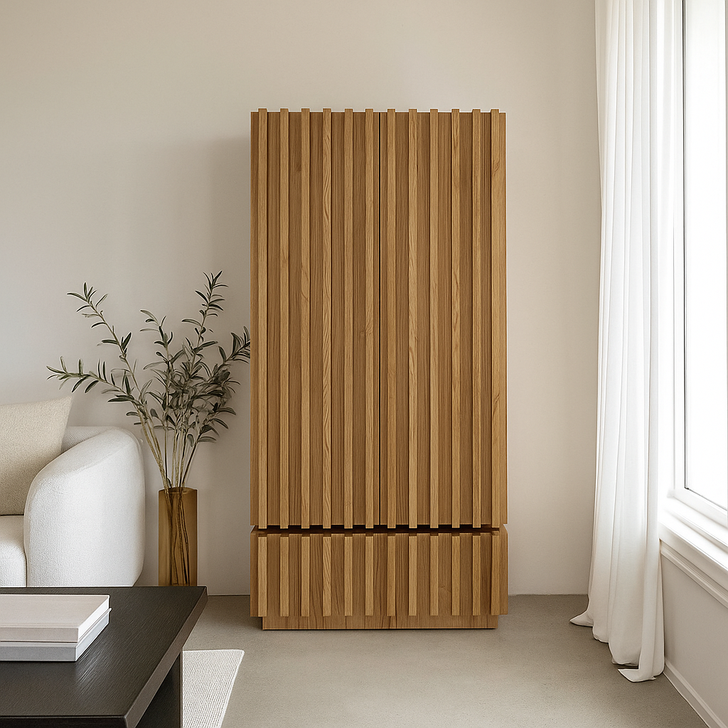 Шкаф Fence отличается выразительными дверцами. В его конструкции две двери и один вместительный ящик. Дверцы легко открываются. В каждой секции расположена штанга для одежды. По желанию можно установить подсветку по периметру. Корпус выполнен из МДФ с декоративным покрытием или шпоном.
