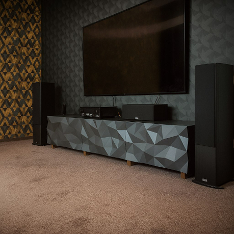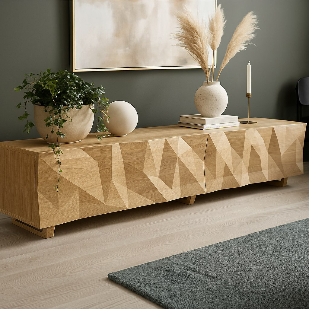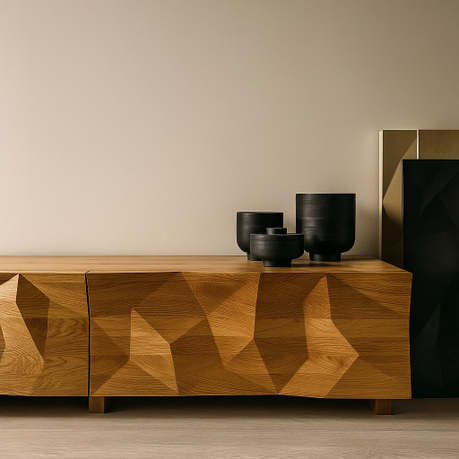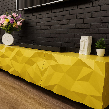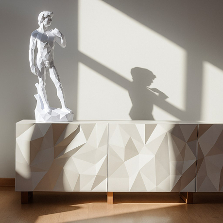 Рисунок фасадов создается с помощью фрезеровки. Ломаные грани разных форм и размеров создают интересный объемный узор, который смотрится единым полотном на всей плоскости фасадов.