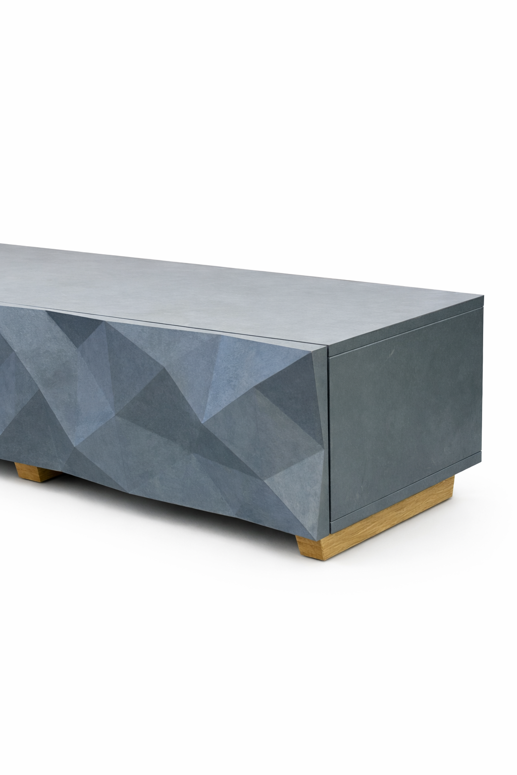 Рисунок фасадов создается с помощью фрезеровки. Ломаные грани разных форм и размеров создают интересный объемный узор, который смотрится единым полотном на всей плоскости фасадов.