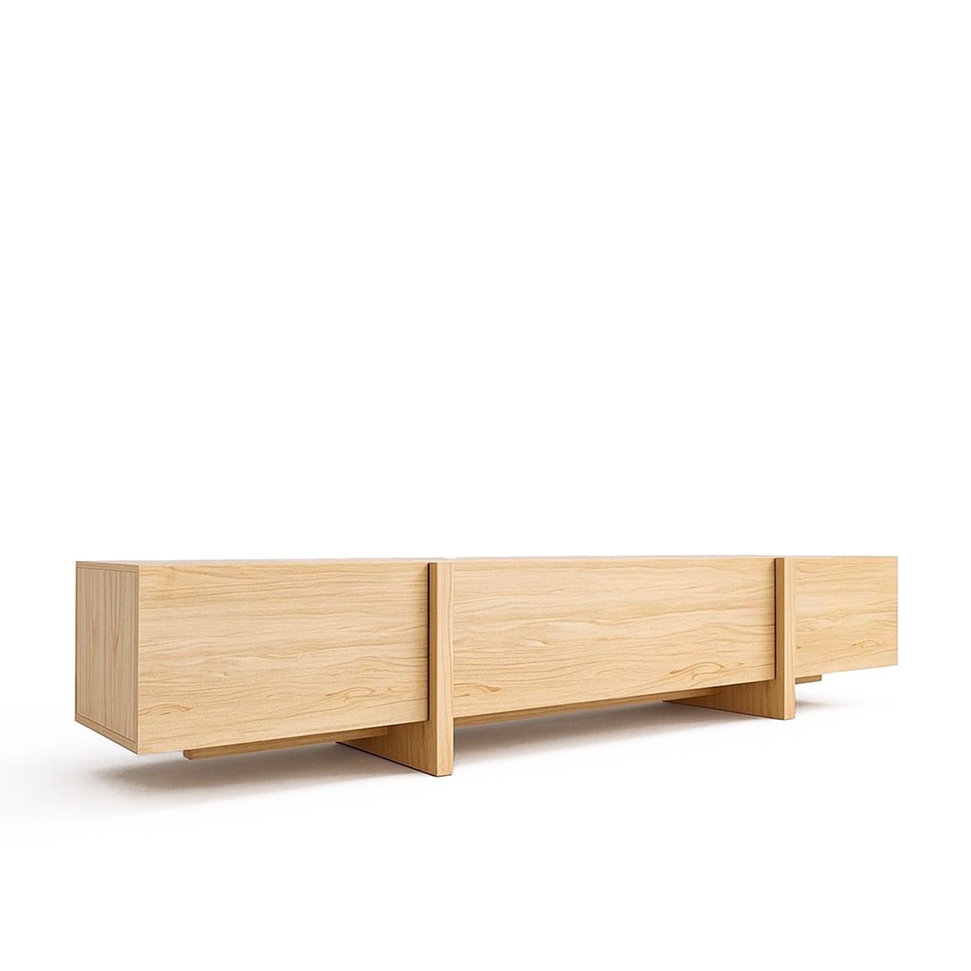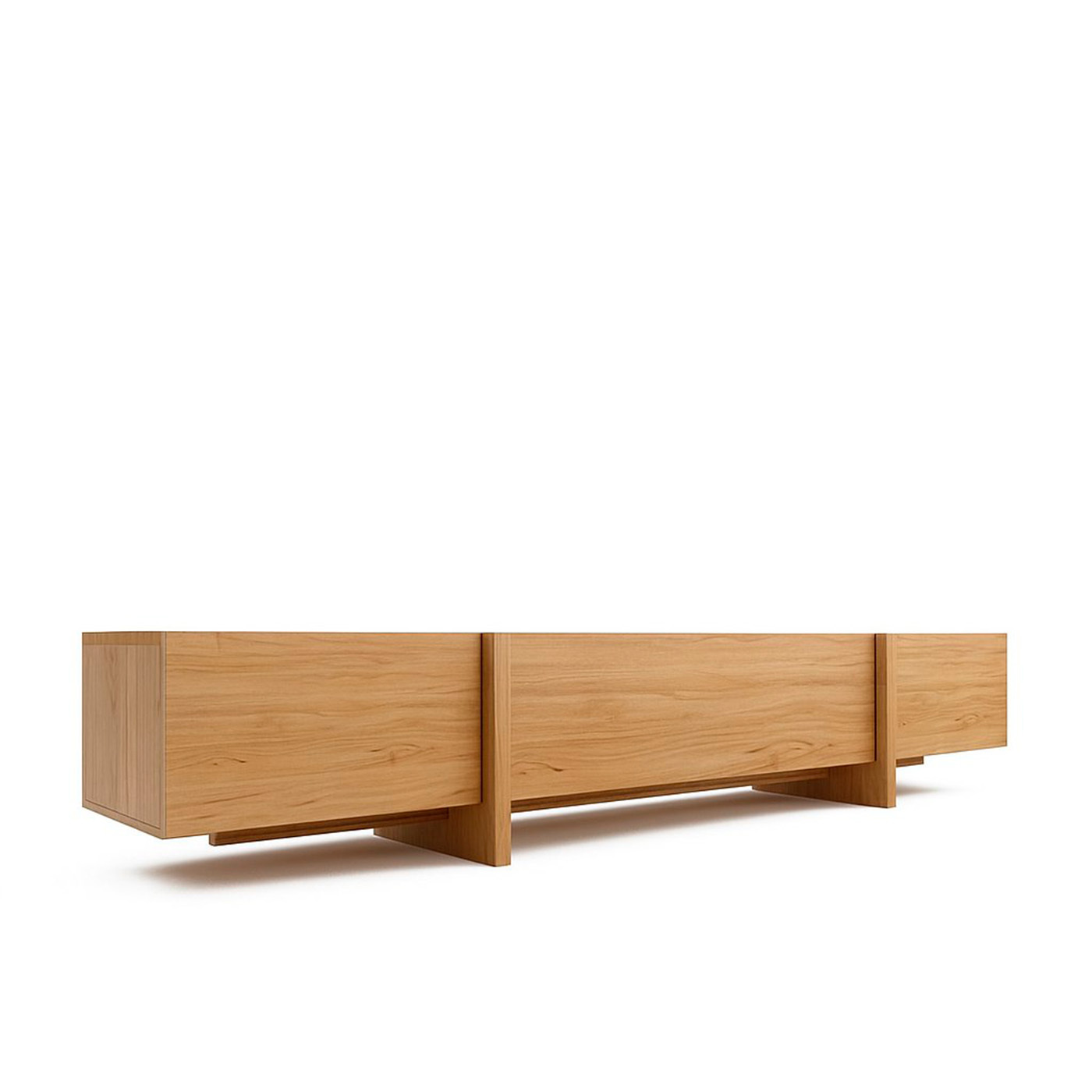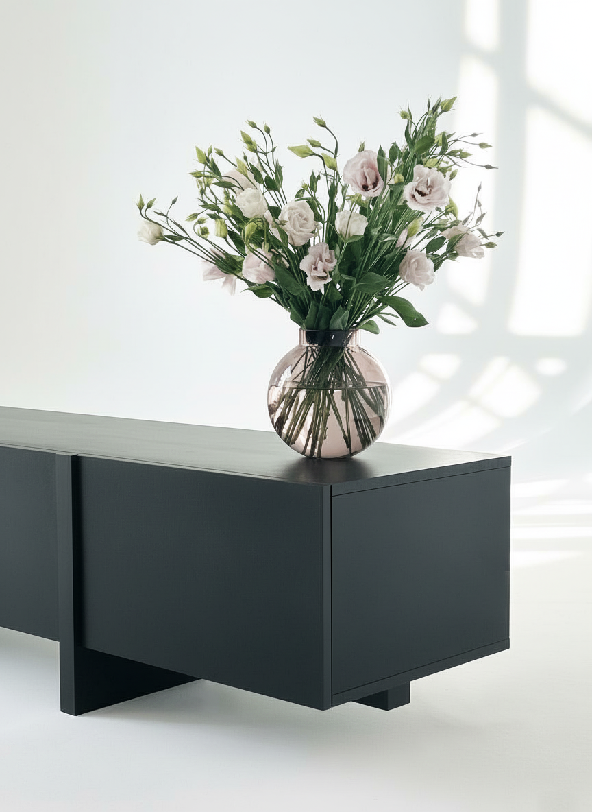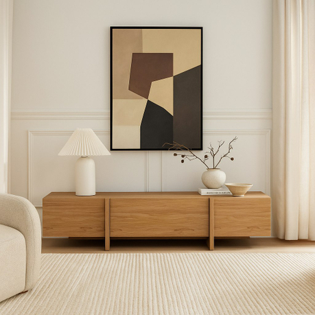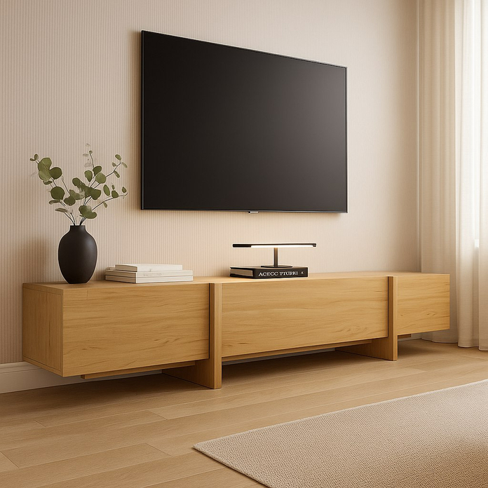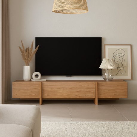 ТВ-тумба под телевизор с центральным ящиком, который открывается при нажатии, и боковыми фасадами, также открывающимися от нажатия. Ножки тумбы выполнены из массива дуба, а корпус — из МДФ, облицованного шпоном.