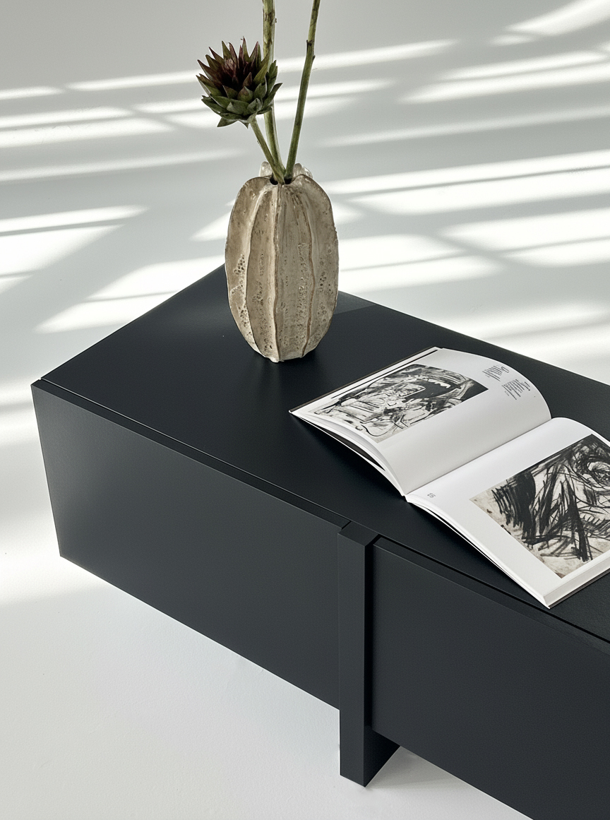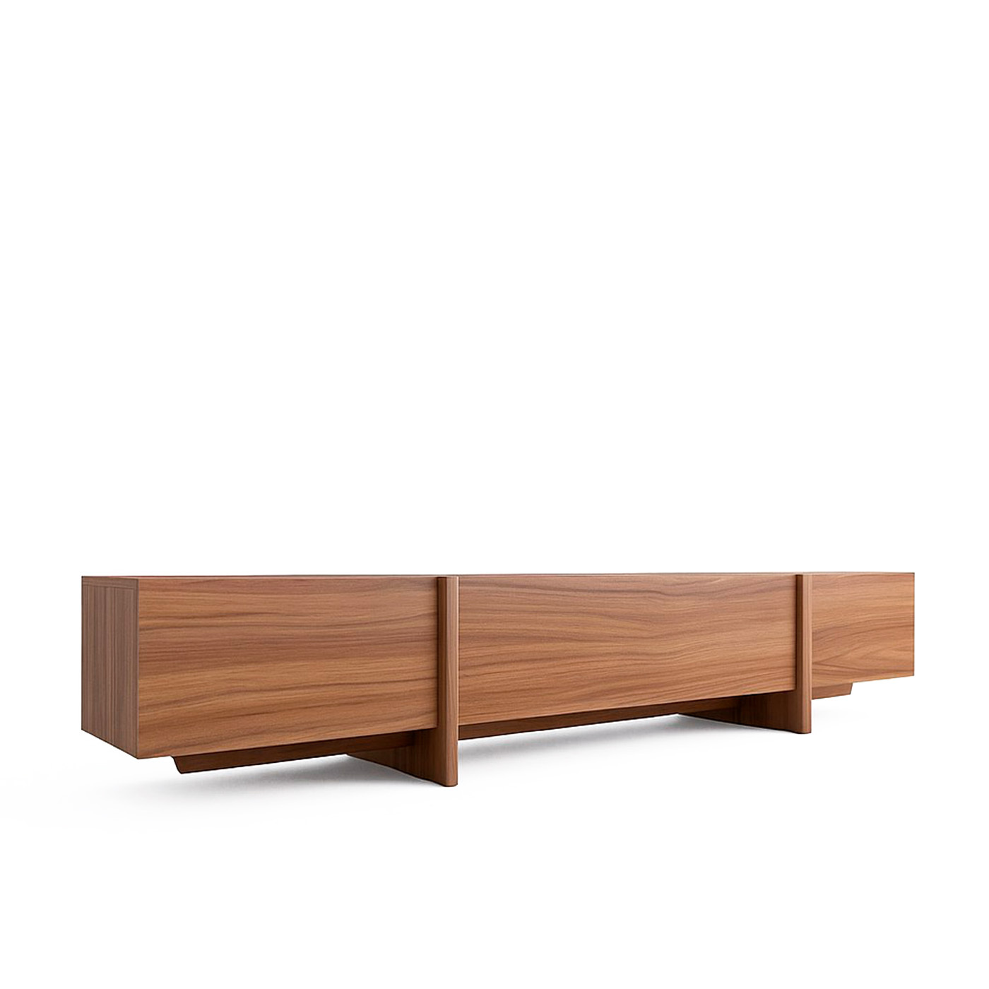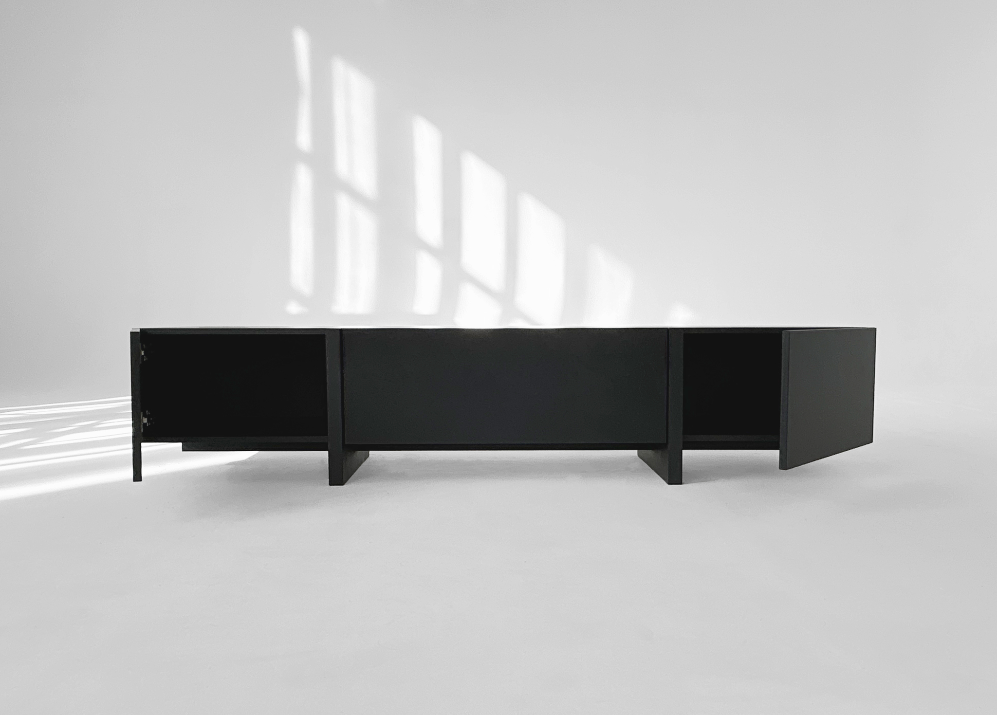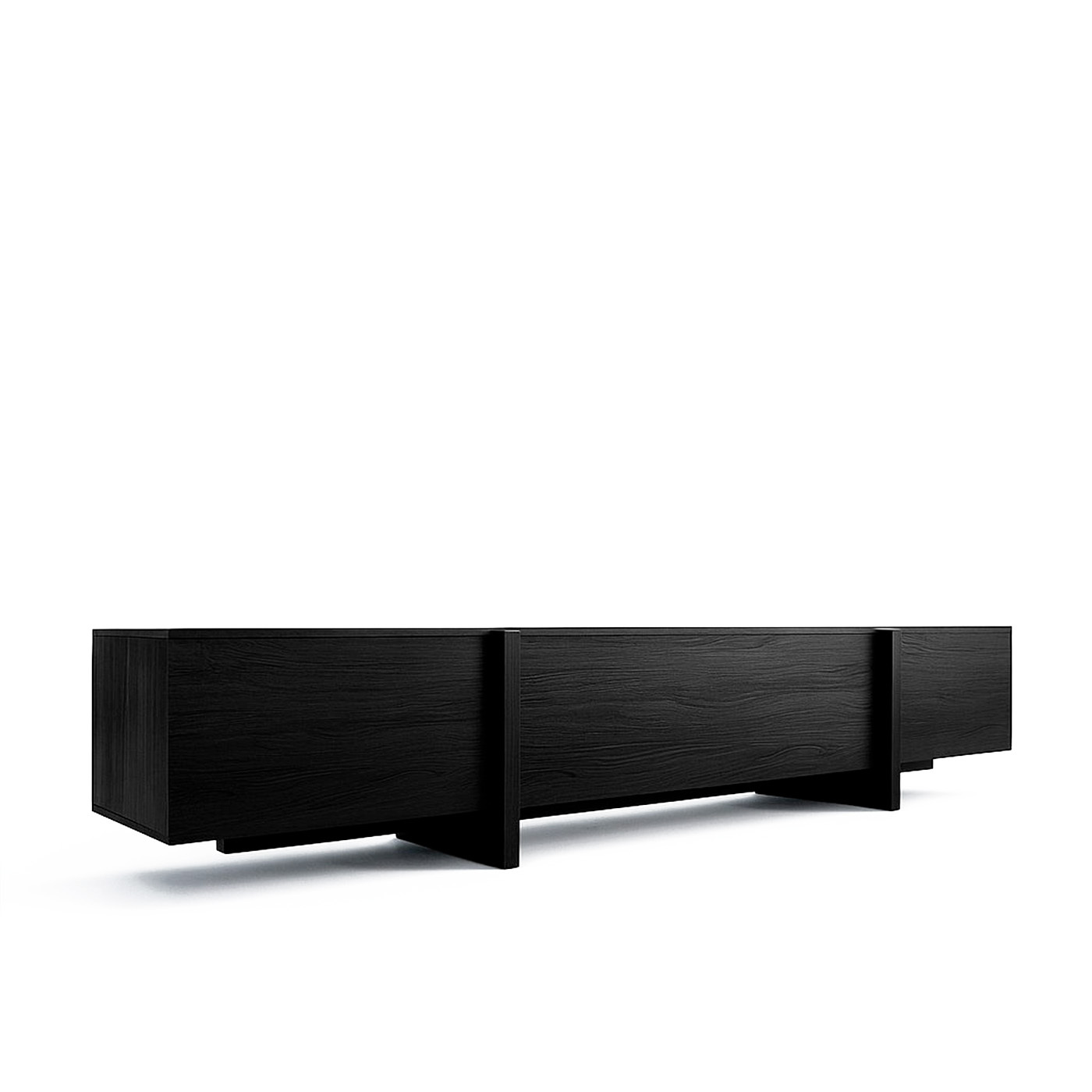 ТВ-тумба под телевизор с центральным ящиком, который открывается при нажатии, и боковыми фасадами, также открывающимися от нажатия. Ножки тумбы выполнены из массива дуба, а корпус — из МДФ, облицованного шпоном.