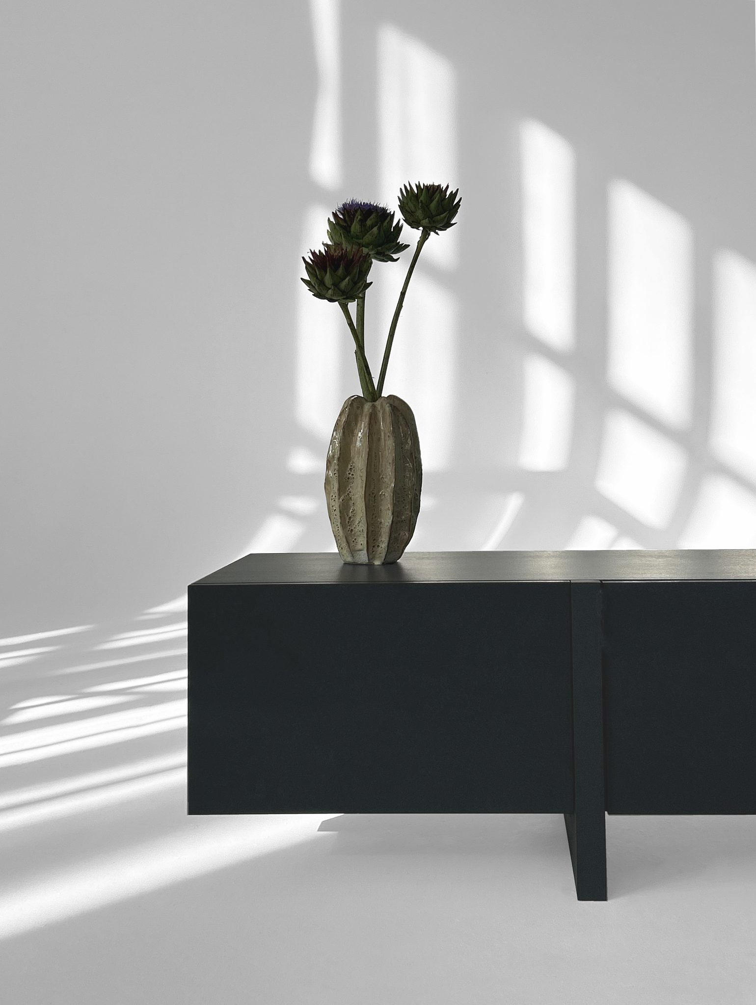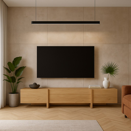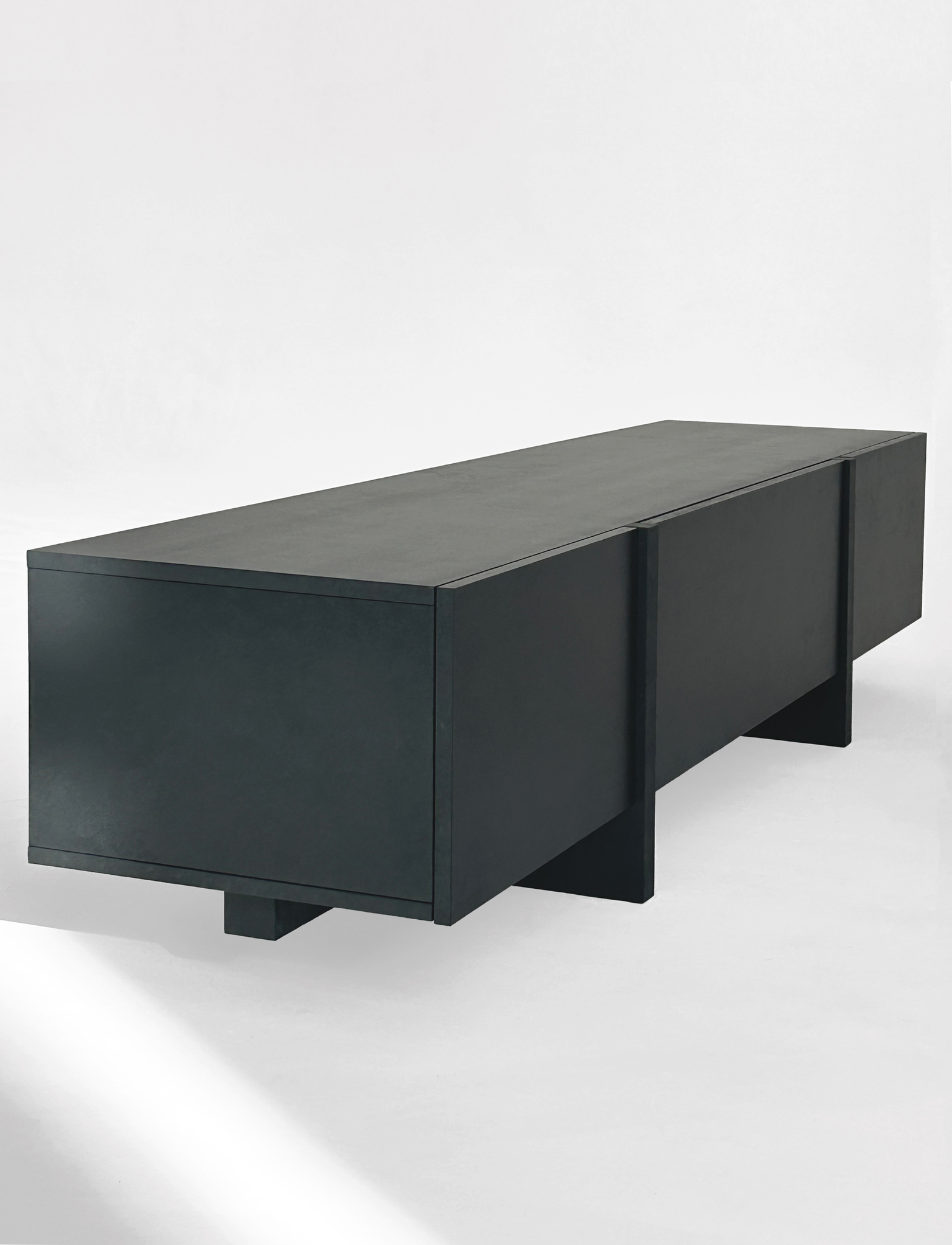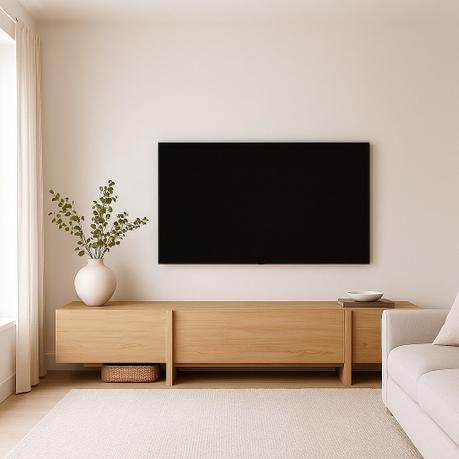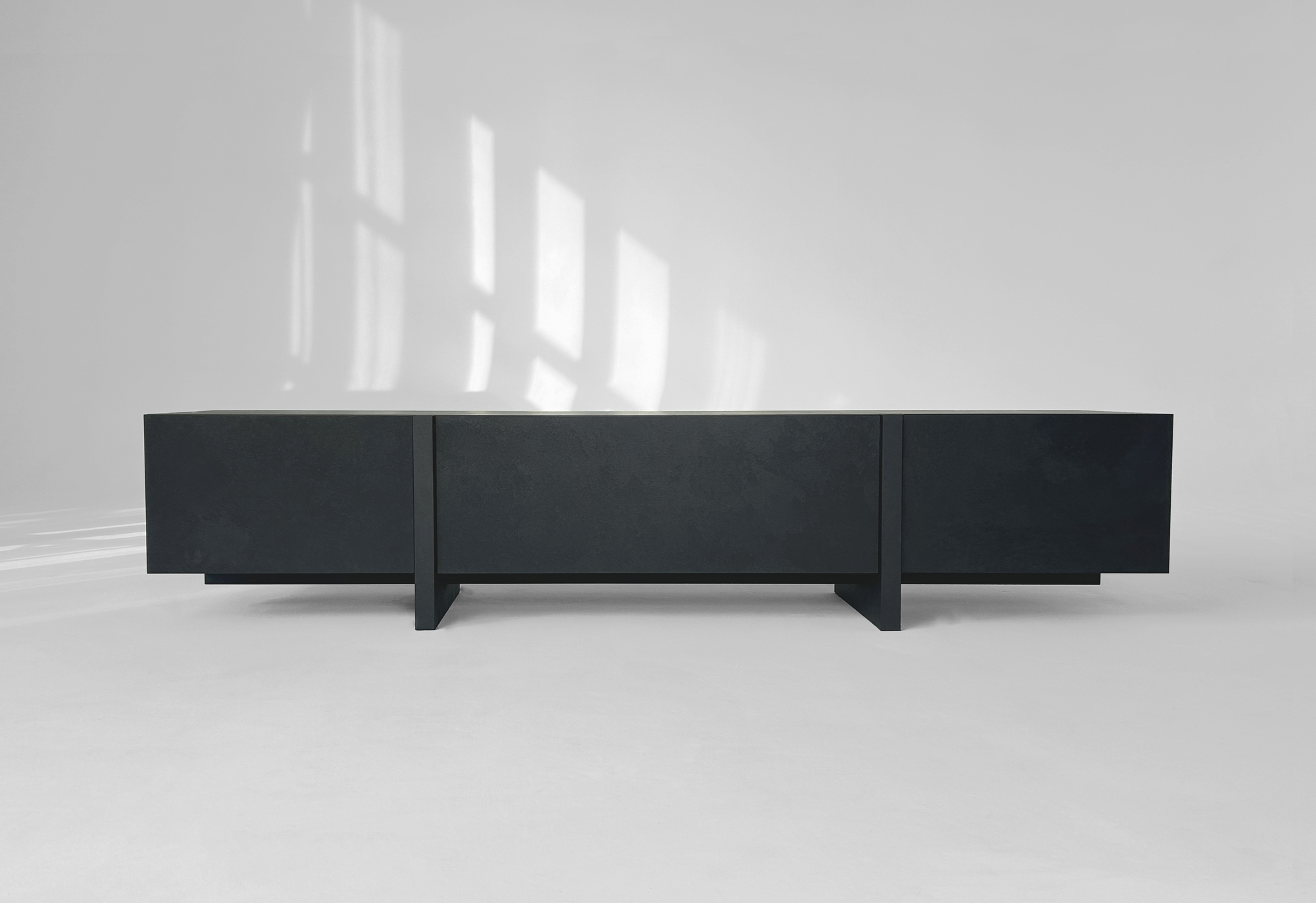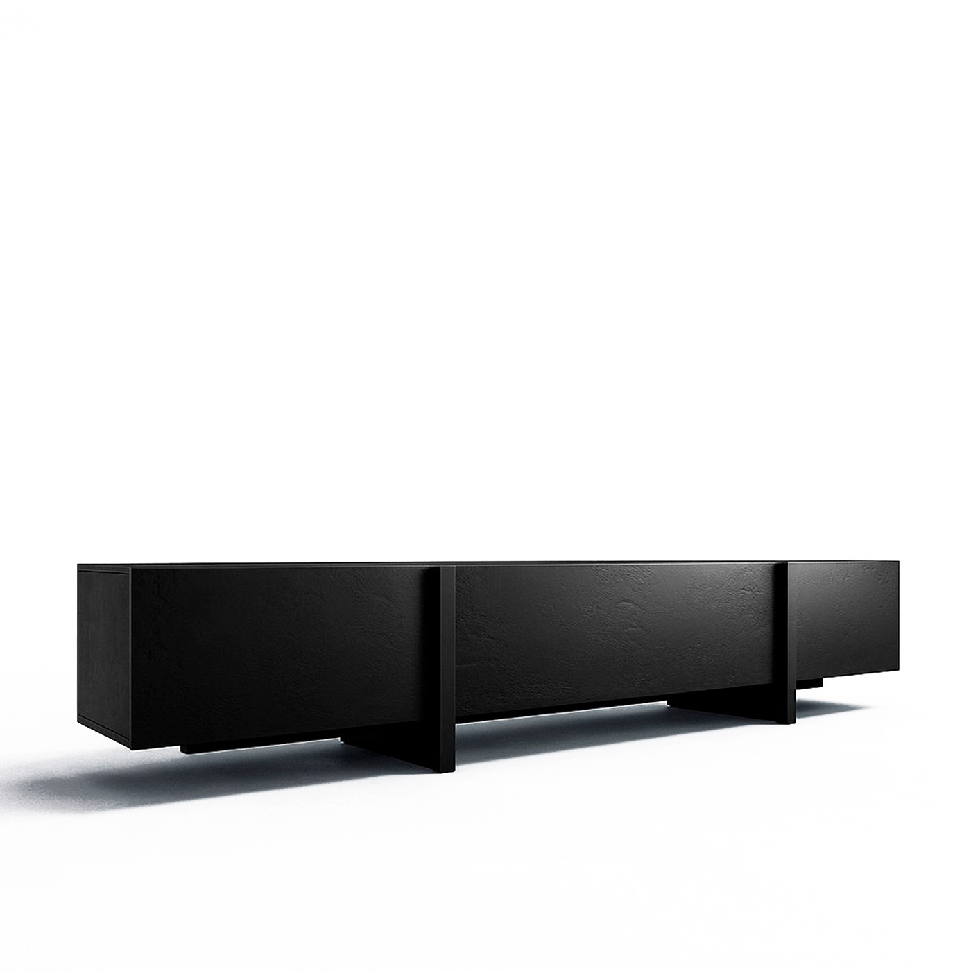 ТВ-тумба под телевизор с центральным ящиком, который открывается при нажатии, и боковыми фасадами, также открывающимися от нажатия. Ножки тумбы выполнены из массива дуба, а корпус — из МДФ, облицованного шпоном.